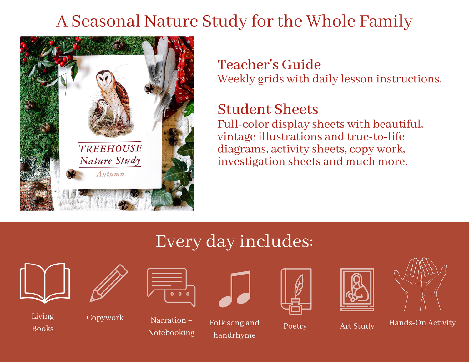 “Early in our home education I went on a search for a gentle guide to take our family on an educational journey through the seasons. I wanted something that was simple and beautiful and that introduced my children to art, poetry, living books, and nature in an organic way. I couldn't find what I had dreamed up in my head, so instead I developed it. My hope is that Treehouse Nature Study is a tool to truly awaken delight and wonder in your home education.”